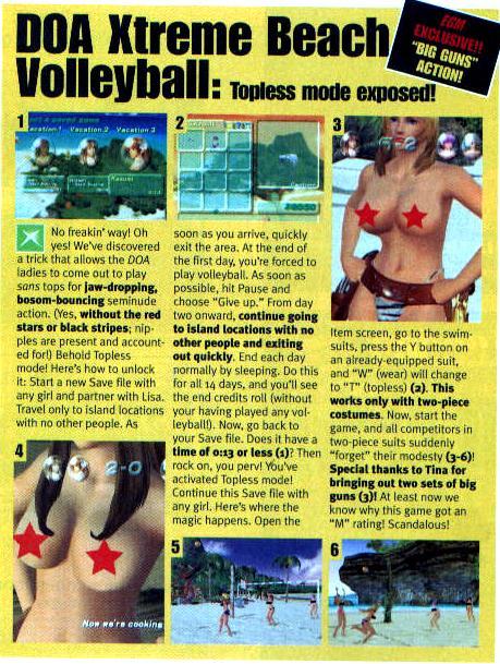 In the April 2003 edition (issue #165) of the videogame publication Electronic Gaming Monthly, the magazine revealed a "nude code" for Xtreme, as an April Fool's day joke. The magazine promised readers they could play the game with the girls topless, in an unlockable nude mode, and also implied that this was the reason for the game's M-rating. Upon discovering the nude code was a hoax, many readers sent angry letters to EGM, despite the fact that such jokes and hoaxes are an annual tradition for EGM.