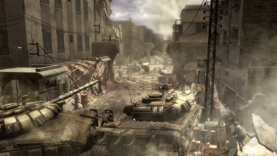 Hot Zone is a one-level, square-shaped stage set in a war zone within a modern city of unknown location. Notable elements of the stage include partly-destroyed buildings, tanks, sandbags, and barbed wire. The overall color scheme is pale and muted, due to the bright sunlight and the dust flying about in the air.